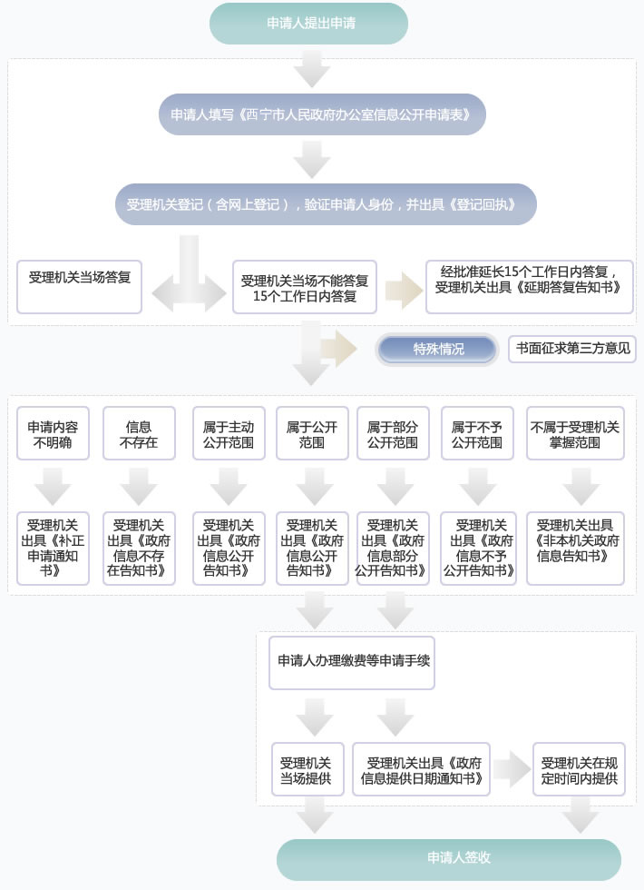 4、通过邮寄信件方式向西宁市人民政府(邮寄地址:西宁市城中区南关街43号,西宁市人民政府,邮编810000)提出申请,申请时须如实、完整填写《政府信息公开申请表》,随同信件一起寄送;信封上务必注明"政府信息公开"字样。